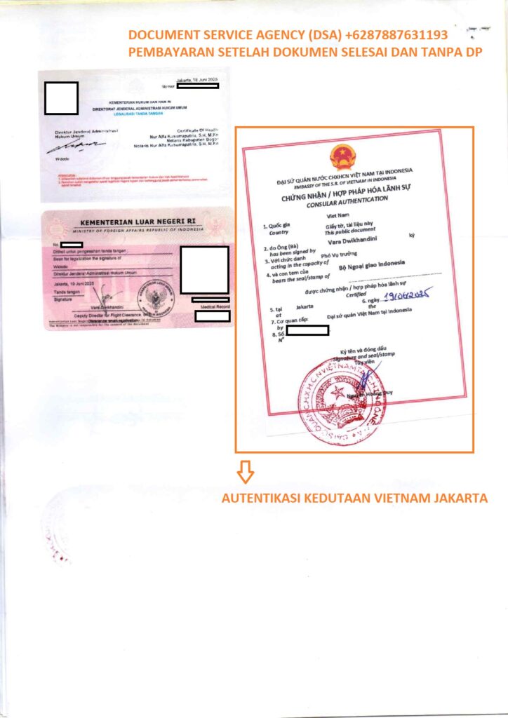 DSA (Document Service Agency) adalah spesialis jasa terjemah, legalisir, atestasi, apostile dokumen untuk keperluan di luar negeri dan pengurusan visa berpengalaman dan terpercaya. Bagi anda yang ingin melegalisir akta nikah di Kedutaan Vietnam untuk keperluan bekerja, pengurusan visa, izin tinggal, dan lain-lain. Percayakan legalisir dokumen anda kepada kami, dengan layanan ” Pembayaran Setelah Dokumen Selesai dan Tanpa DP ” anda akan merasa lebih nyaman dan aman menggunakan jasa kami. Dan dalam hitungan beberapa hari dokumen anda selesai dan siap untuk digunakan.