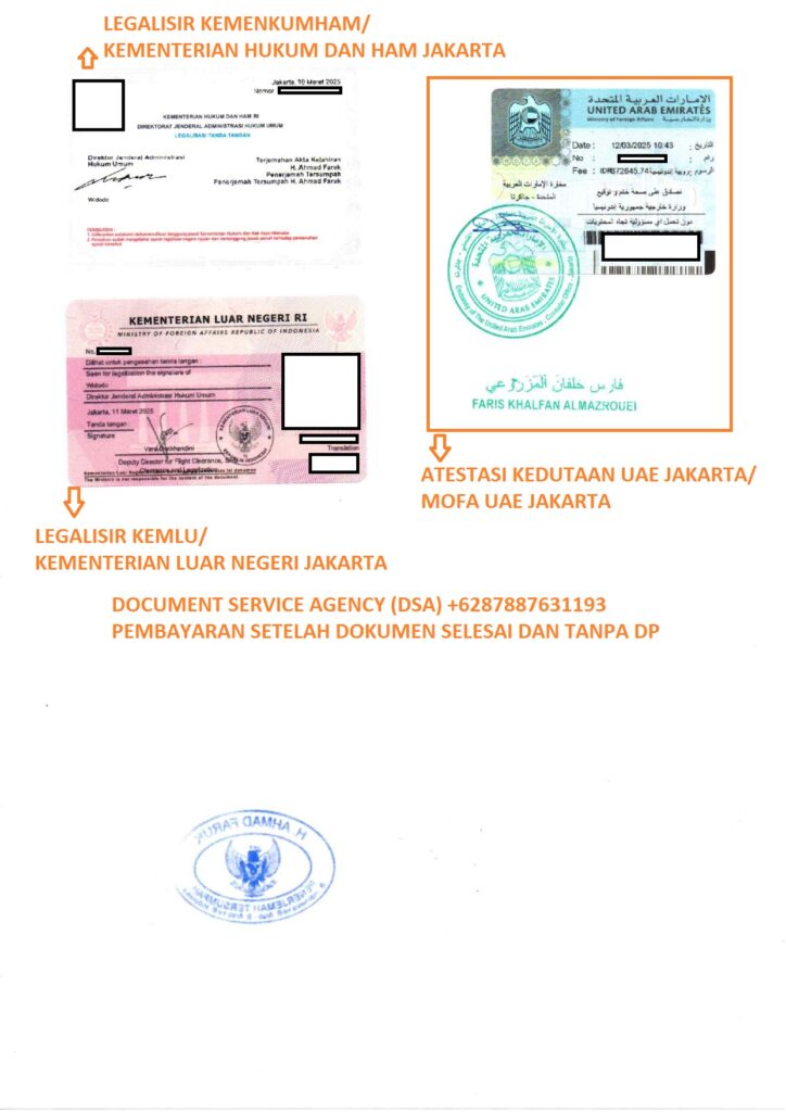DSA (Document Service Agency) adalah spesialis jasa terjemah, legalisir, atestasi, apostile dokumen untuk keperluan di luar negeri dan pengurusan visa berpengalaman dan terpercaya. Bagi anda yang ingin melegalisir buku nikah di Kedutaan Uni Emirates Arab/ UAE untuk keperluan pengurusan visa, izin tinggal, pendaftaran pernikahan dan lain-lain. Anda tidak perlu datang ke Jakarta karna pengurusan dokumen anda bisa diwakilakan kepada kami, dengan layanan ” Pembayaran Setelah Dokumen Selesai dan Tanpa DP ” membuat anda lebih nyaman dan aman menggunakan jasa kami.