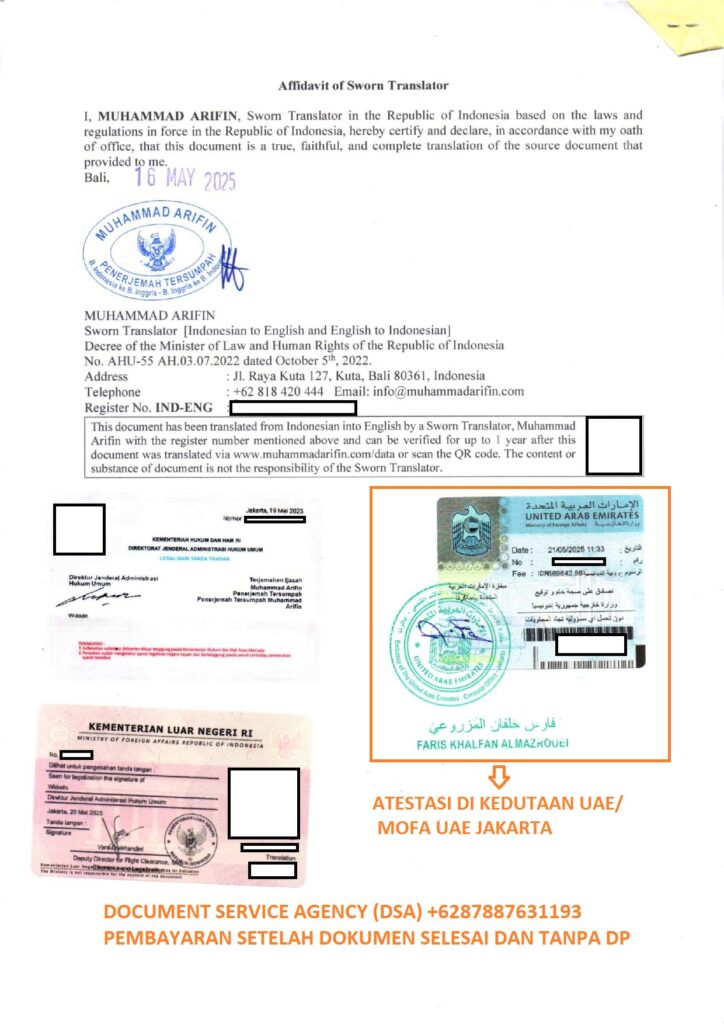 DSA (Document Service Agency) adalah spesialis jasa terjemah, legalisir, atestasi, apostile dokumen untuk keperluan di luar negeri dan pengurusan visa berpengalaman dan terpercaya. Bagi anda yang ingin melegalisir ijazah di Kedutaan Uni Arab Emirates untuk keperluan bekerja, pengurusan visa, izin tinggal, dan lain-lain. Percayakan legalisir dokumen anda kepada kami, dengan layanan ” Pembayaran Setelah Dokumen Selesai dan Tanpa DP ” anda akan merasa lebih nyaman dan aman menggunakan jasa kami. Dan dalam hitungan beberapa hari dokumen anda selesai dan siap untuk digunakan.